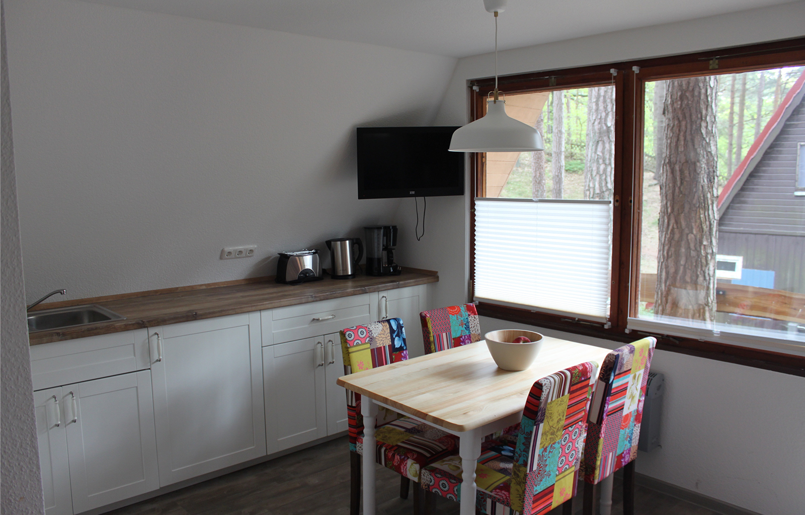 Und was Sie noch in Ihrer Finnhütte erwartet: Eine Küchenzeile mit Kühlschrank, Spüle, 2 mobilen Kochfeldern, Wasserkocher, Kaffeemaschine, Toaster und diverse Einzelteile, die Sie täglich brauchen. Wen einmal Messer, Gabel, Schere nicht genügend zur Verfügung stehen sollten, wenden sie sich bitte an unsere Verwaltung.